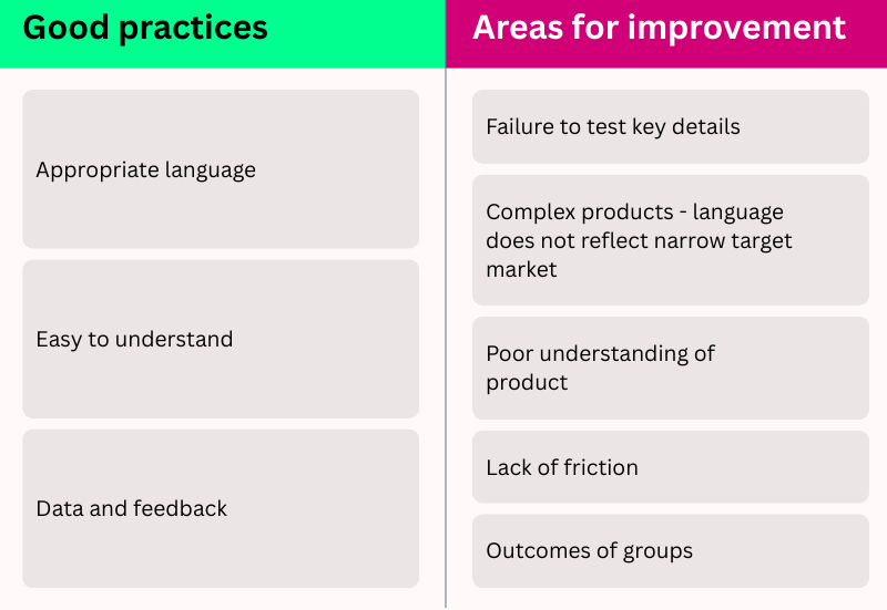 Use of appropriate language – Firms who extensively test the language used in their website, apps, and promotions – feeding this into product design and governance.